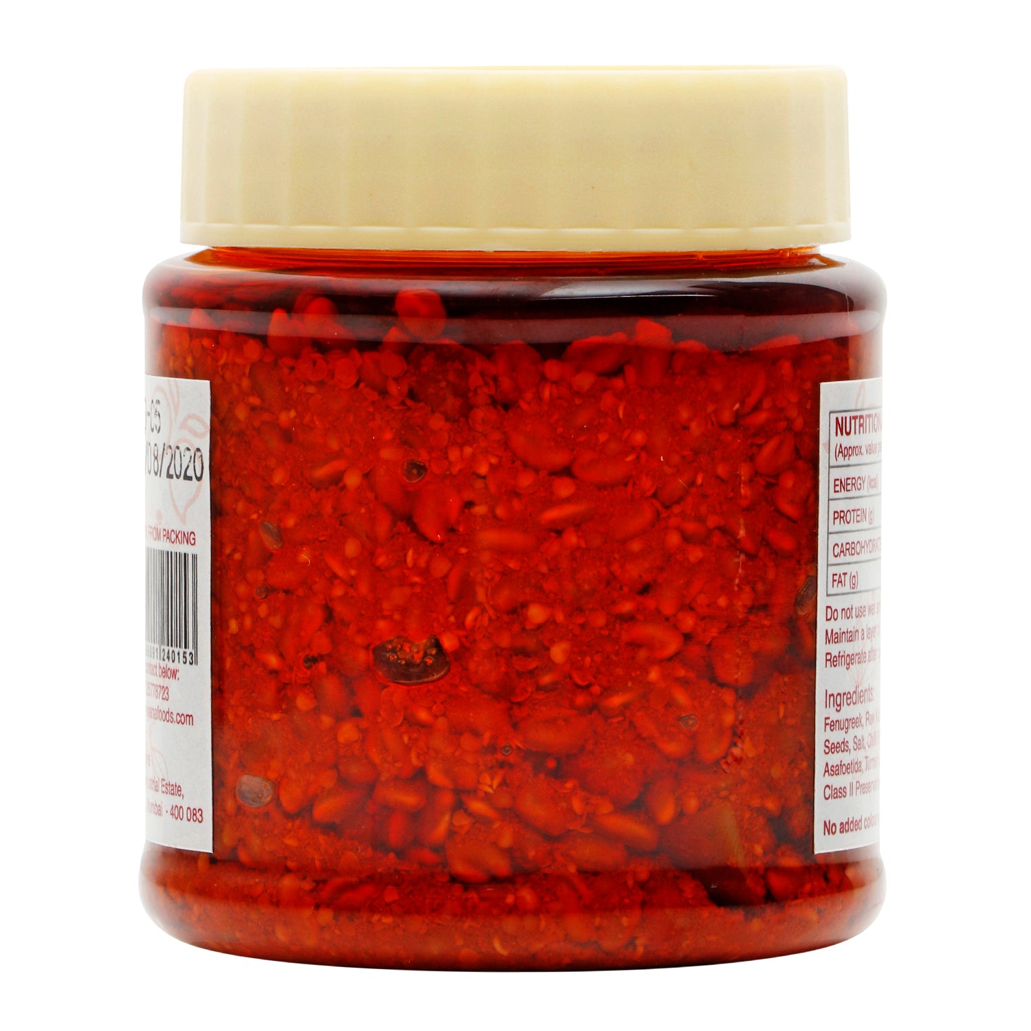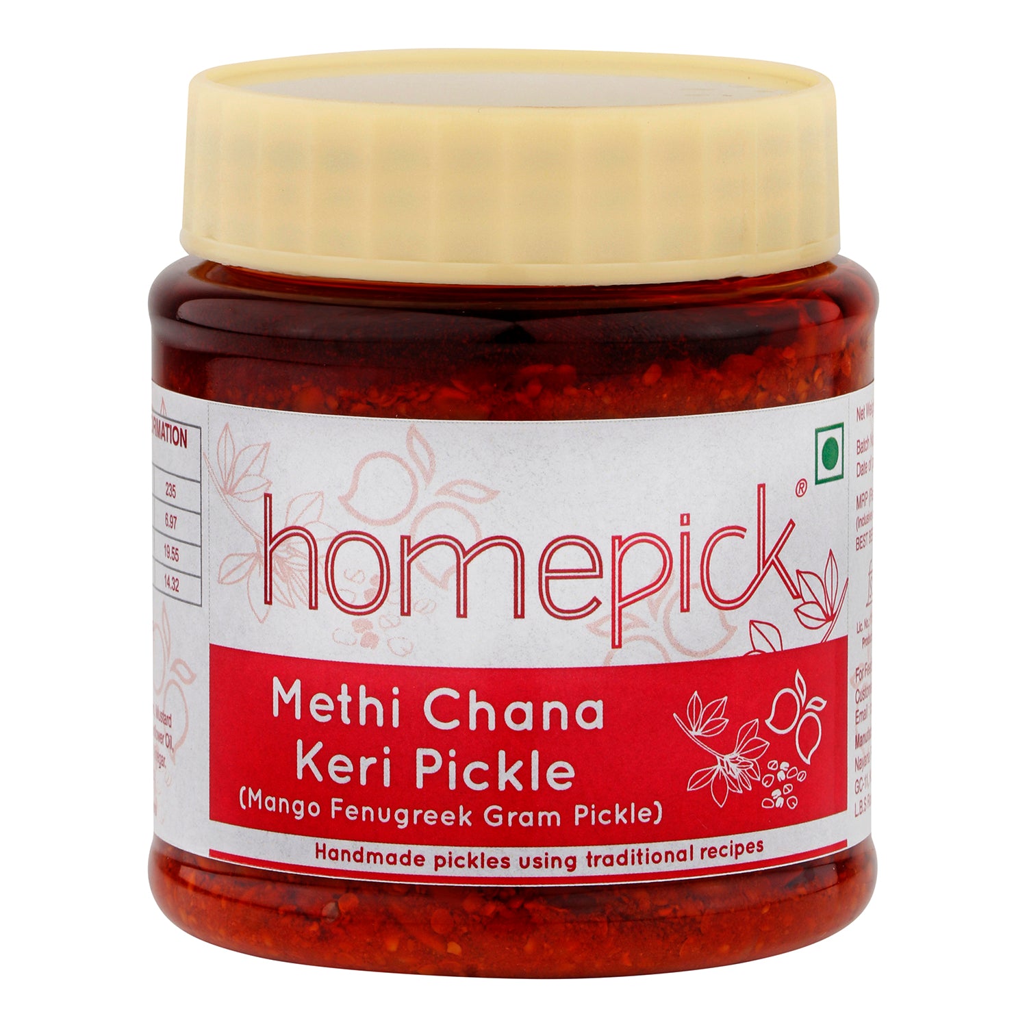 Methi-chana-keri pickle is a tantalizing blend of flavors, capturing the essence of Indian cuisine with its bold and zesty profile. This pickle combines the earthy bitterness of fenugreek seeds (methi), the nuttiness of chickpeas (chana), and the tanginess of raw mangoes (keri), creating a harmonious symphony of taste.With its savory, tangy, and slightly bitter notes, it's a pickle that promises a delightful sensory experience with every bite.